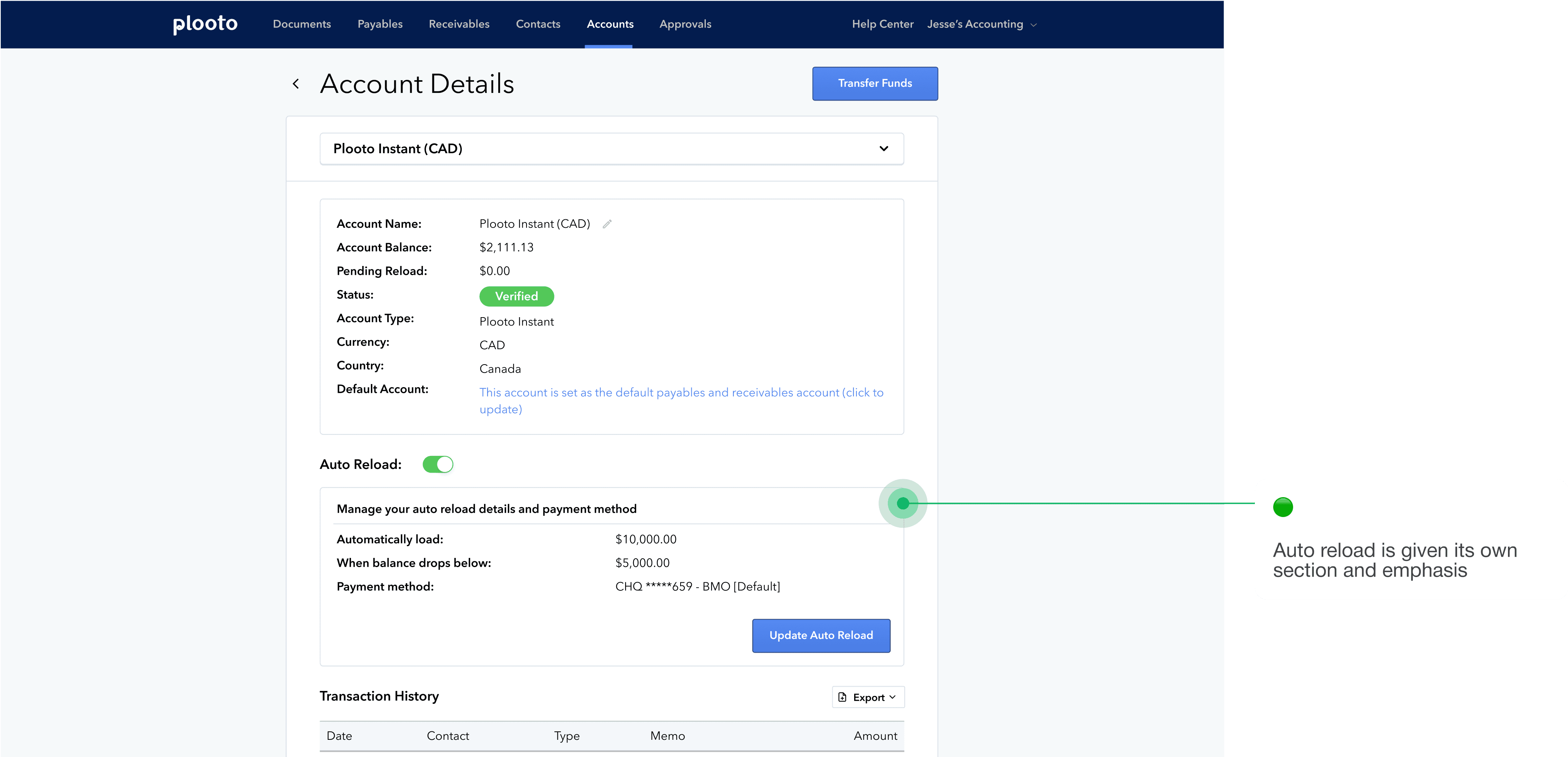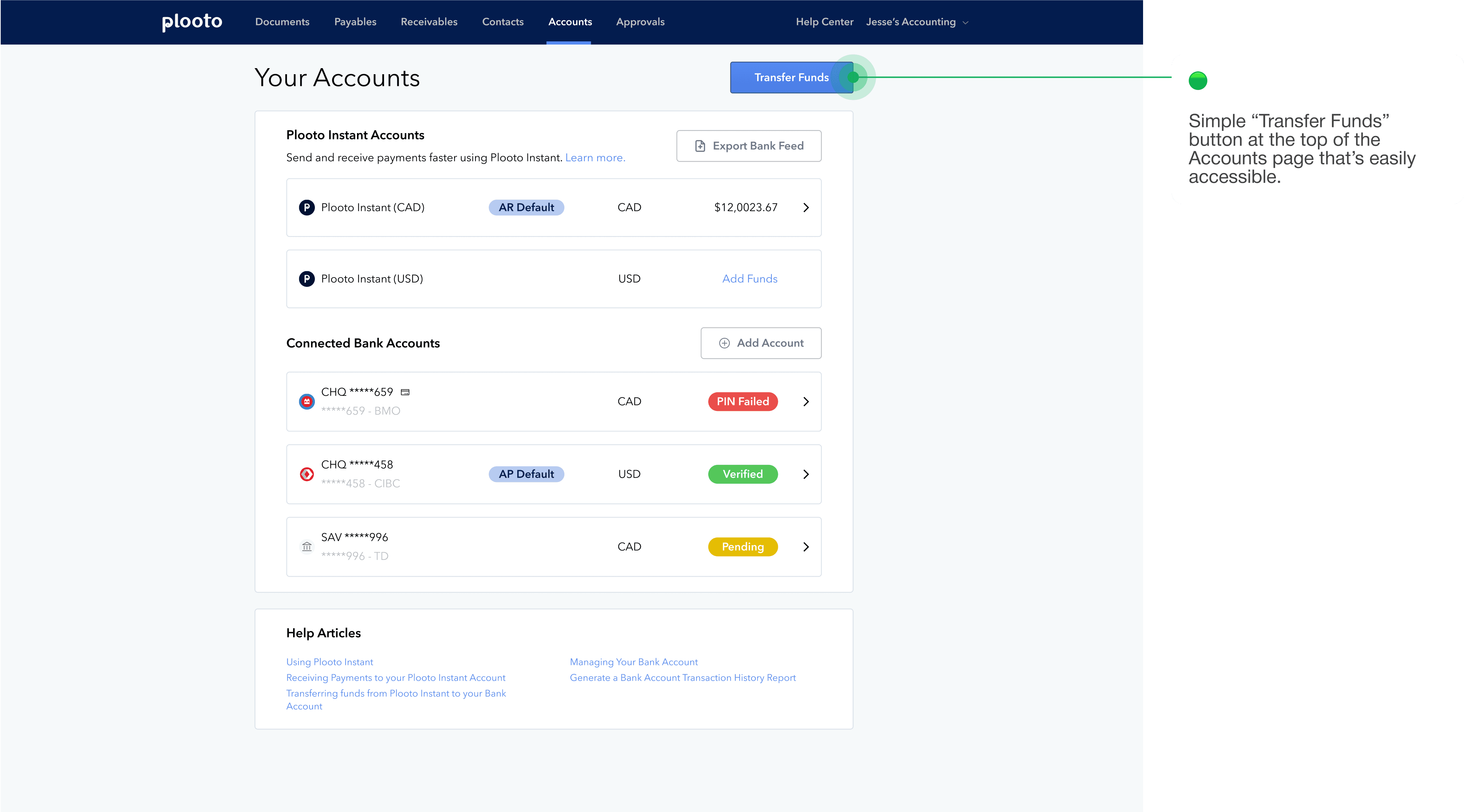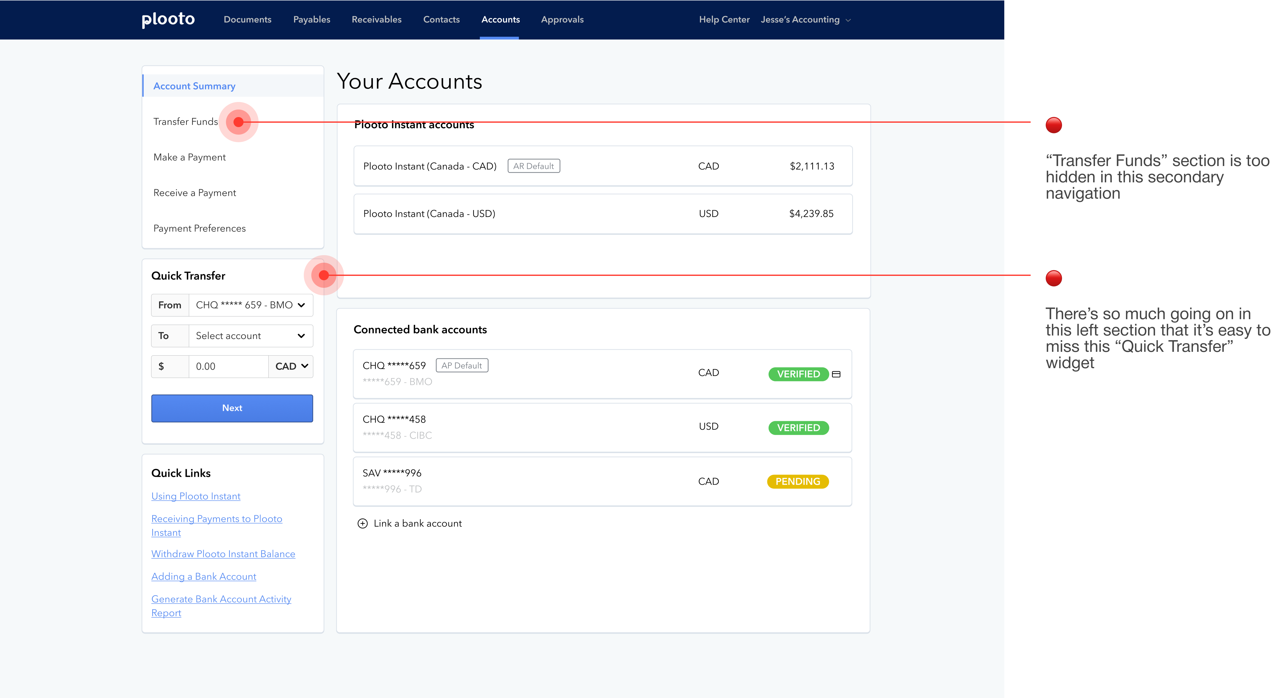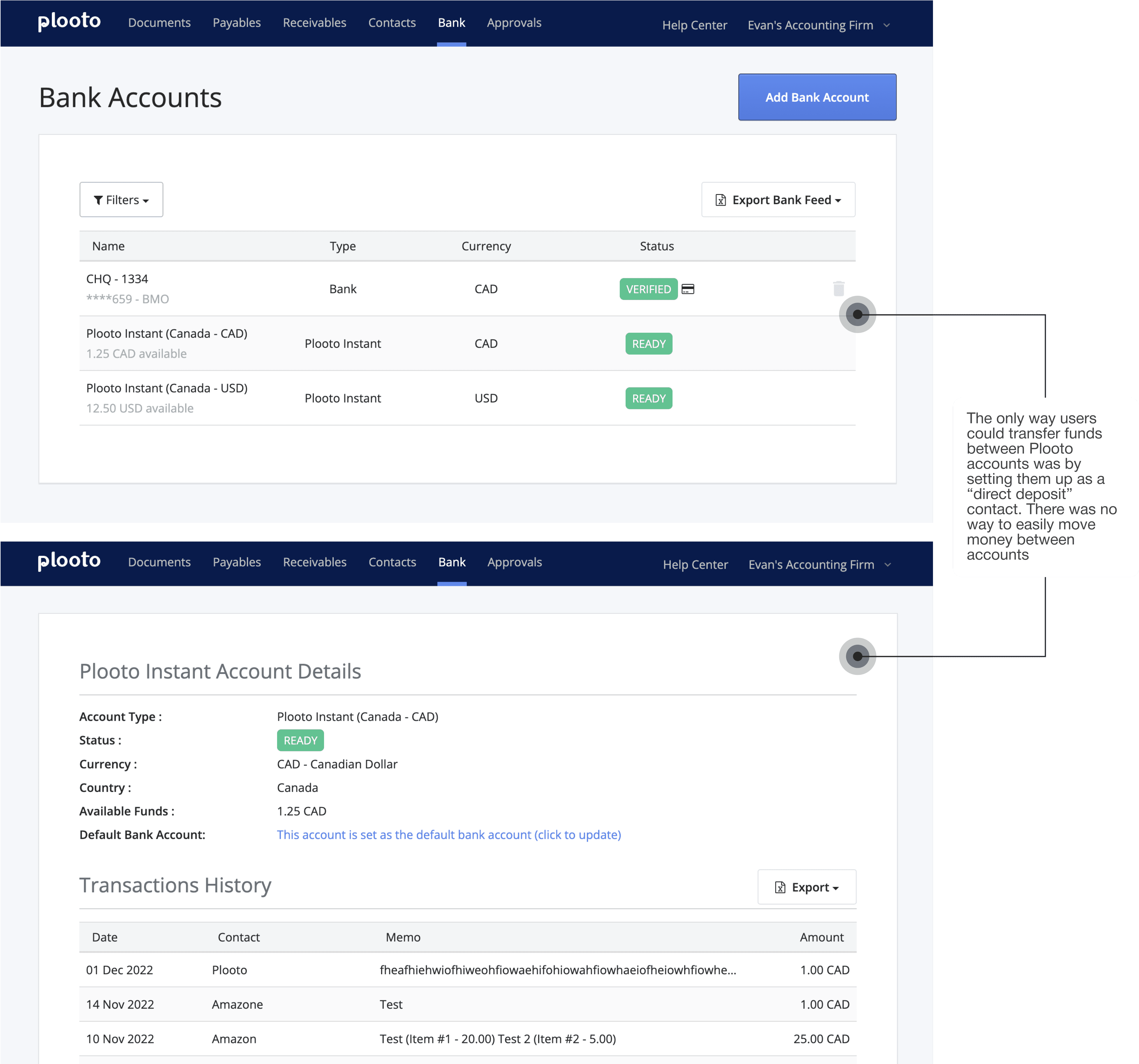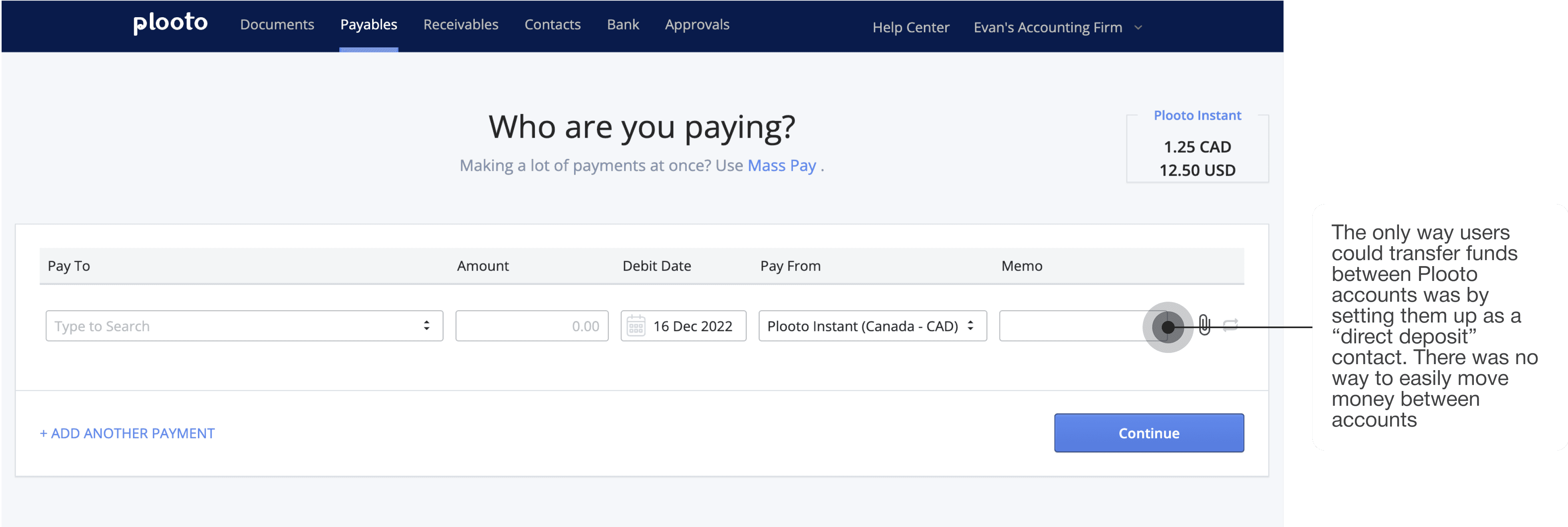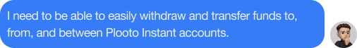 One of the biggest pain points was how difficult it was to transfer funds between and out of Plooto Instant accounts. Users had to set themselves up as a “direct deposit” contact and then send money to their email instead of moving funds directly between accounts.