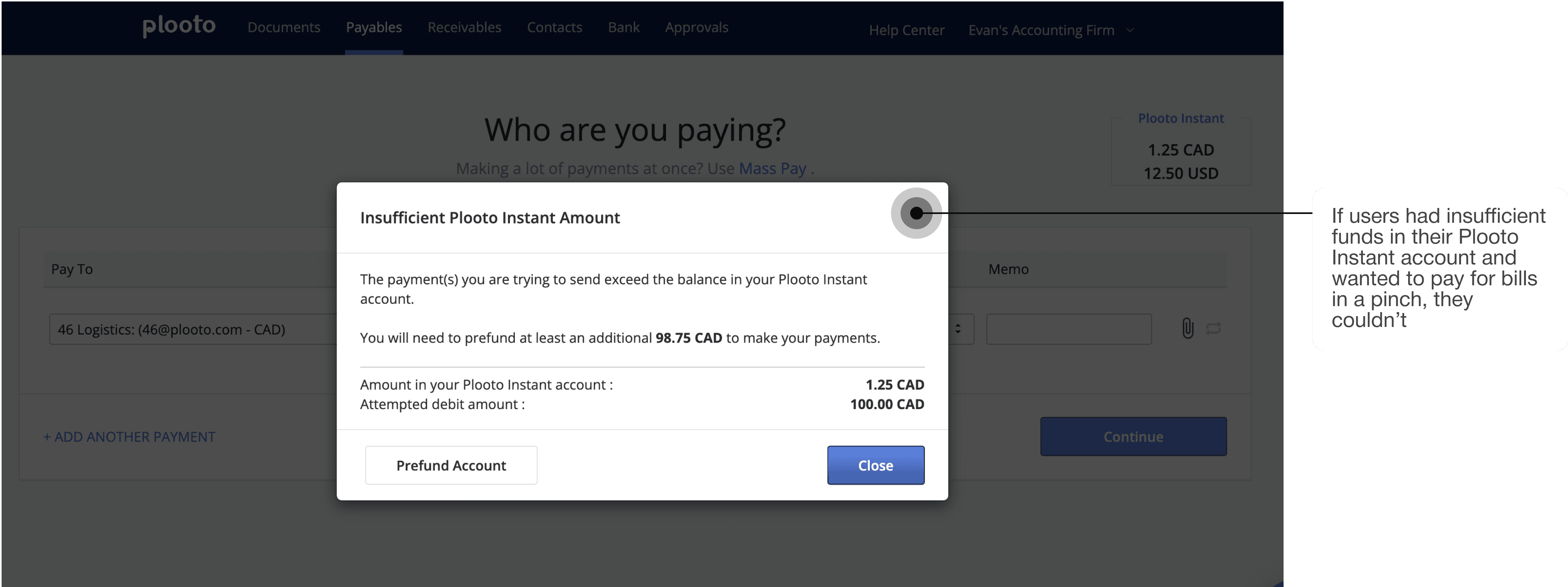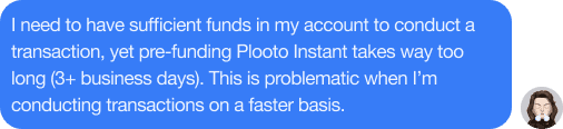 Another major pain point was account pre-funding delays. Adding funds to a Plooto Instant account took 3-5 business days to process. This was especially problematic because if users had insufficient funds in their account, they wouldn’t be able to pay for bills in a pinch.